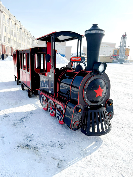 Аренда безрельсового электрического мини-паровоза в ретро-стиле на мероприятие в Москве и Московской области. Наш новогодний и рождественский паровозик очень похож на старинные паровозы, которые отправляются в путешествие по зимней Карелии, Золотому кольцу, Уралу или другим городам России. Стильный черный паровоз с большой трубой и красной звездой будет катать ребятишек и их родителей на праздничной площадке и каждый желающий сможет отправиться в новогоднее путешествие.